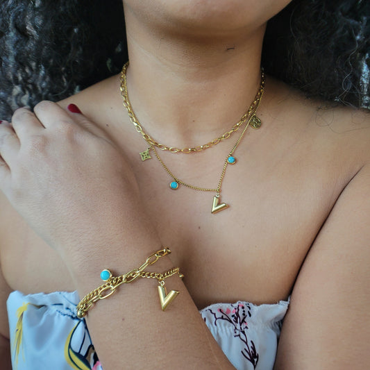 Collar Doble Capa - Piedra Turquesa / Colgante "V"