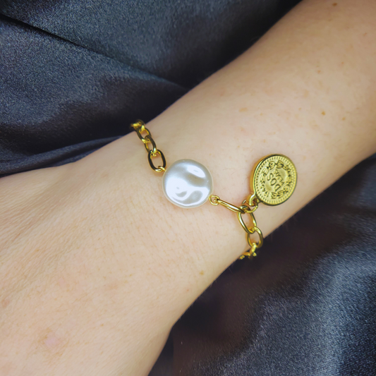 Pulsera Medallón y Perlas - Acero Inoxidable